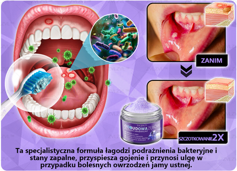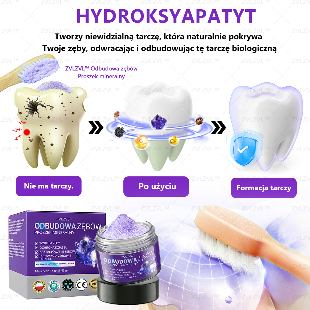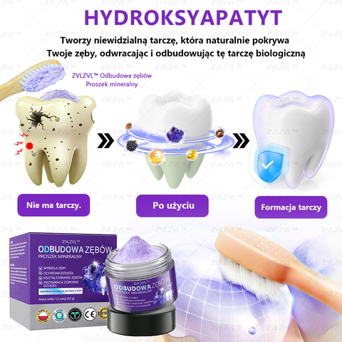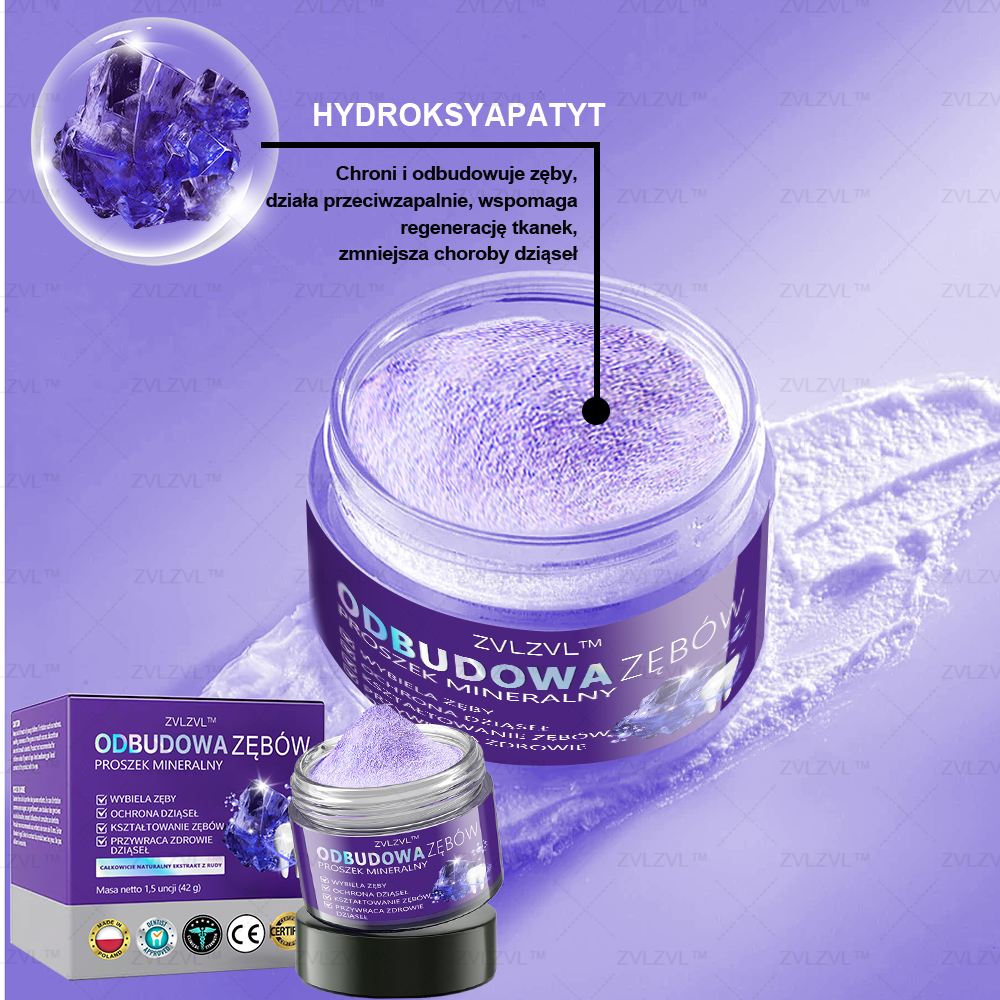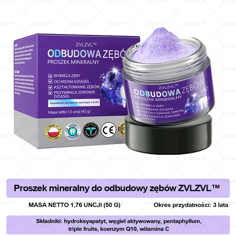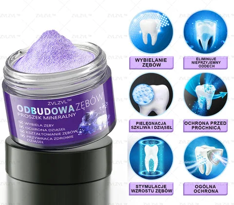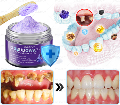 ZVLZVL™ Proszek Mineralny do Przywracania Zębów eliminuje 99,99% bakterii, likwiduje nieświeży oddech, usuwa płytkę nazębną i kamień nazębny, leczy zapalenie dziąseł i przyzębia, łagodzi ból zębów, zapobiega i leczy ubytki, odbudowuje szkliwo zębów, stymuluje tworzenie zębiny naprawczej i wspomaga regenerację utraconych zębów.